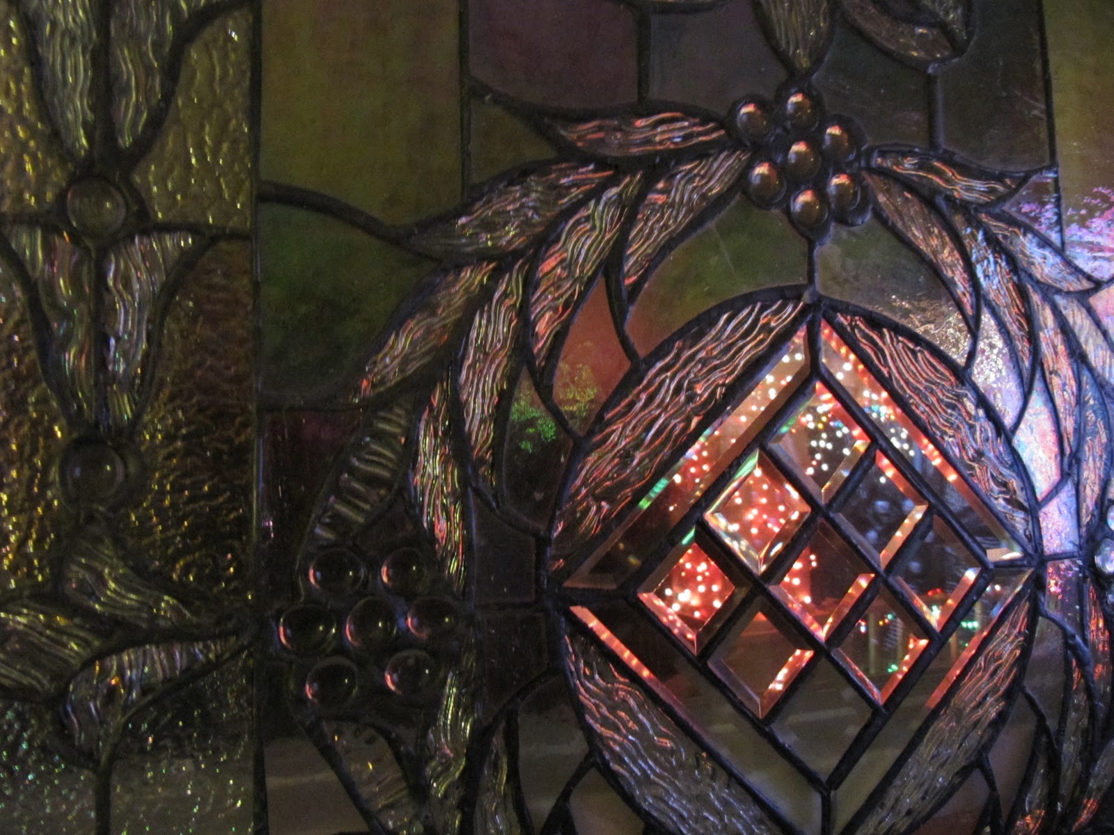 The photo above is of a vintage box of Christmas ornaments that we actually found in the rafters of my husband's parents house when we were going through it with his sisters before the house and all it's contents were to be sold. I treasure this box and it's ornaments inside. The tins are my small collection of Christmas red tins, vintage of course. The little one is my newest, a gift in a "swap" of crochet friends on Ravelry in the "We Love Lucy" group. We all came together with a common interest of our friend and fellow blogger, Lucy, from Attic24 in the UK.Above is a sneak preview of the outside lights taken through our leaded glass window.
