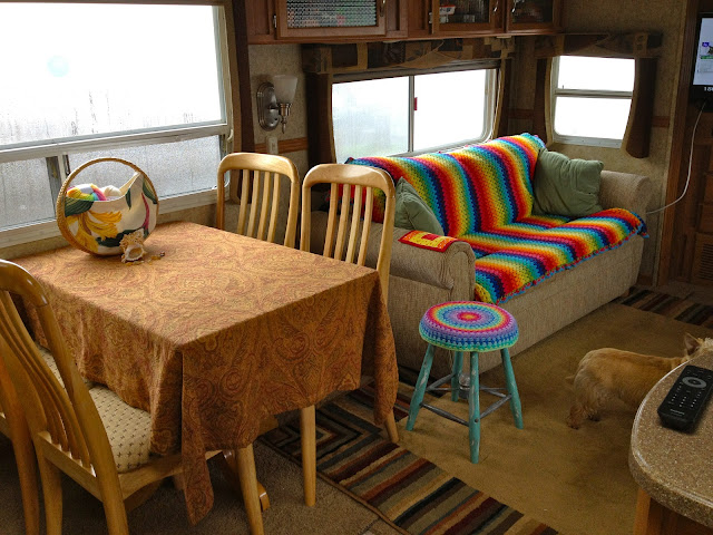 It's been raining all day but I don't mind one bit as we are warm and cozy in our trailer with the roar of the ocean outside.  I took some photos of the inside of our trailer/caravan. I brought the pillow cover from the house and plopped it on the little vintage stool I got last year.  Dayle uses it to rest his coffee cup on in the morning.  If you're new to my blog, that colorful throw on our sofa is my Granny Stripe crochet blanket I made.