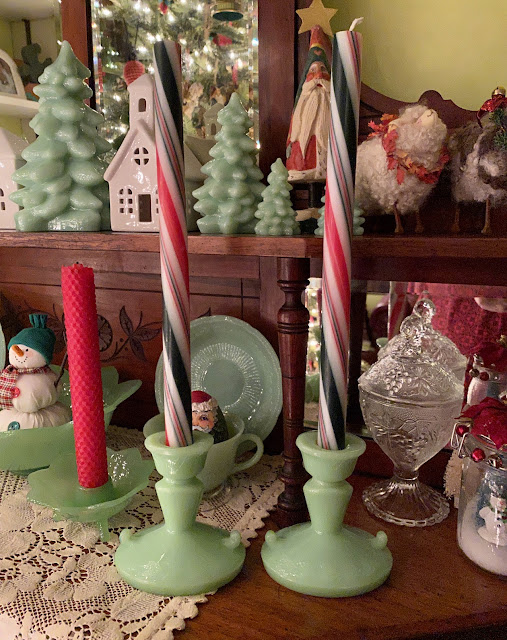 16. It's so pretty and festive at your place, Teresa. You have so many pieces that are gorgeous! How lovely to add to your jadeite with those candlesticks. I really like the candy cane candles!